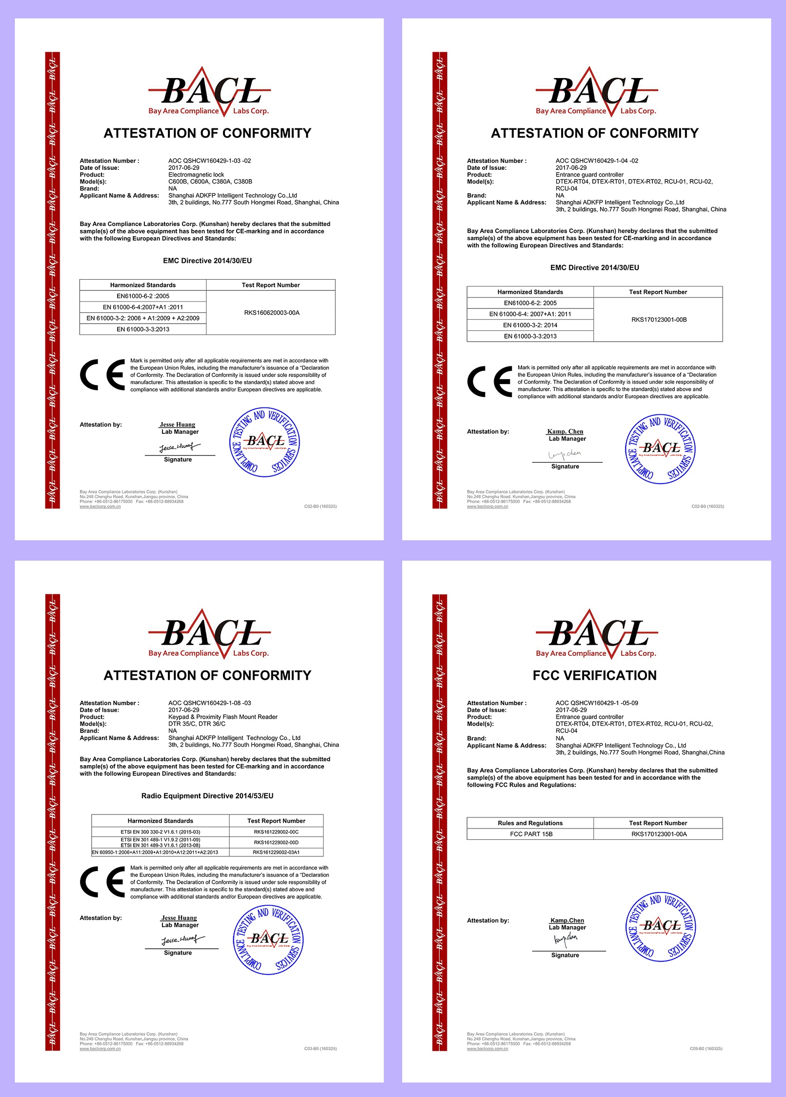 近日,費(fèi)浦安防憑借優(yōu)異的產(chǎn)品性能和雄厚的科研力量,本公司的門禁控制器、讀卡器、電鎖等產(chǎn)品于2017年06月相繼通過FCC和CE認(rèn)證,這是公司在科研創(chuàng)新道路上又一里程牌式事件。
